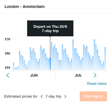 Once you’ve selected a destination, look to the right as this graph does allow you to toggle through the trip duration and you can spot where the cheaper prices will lie.