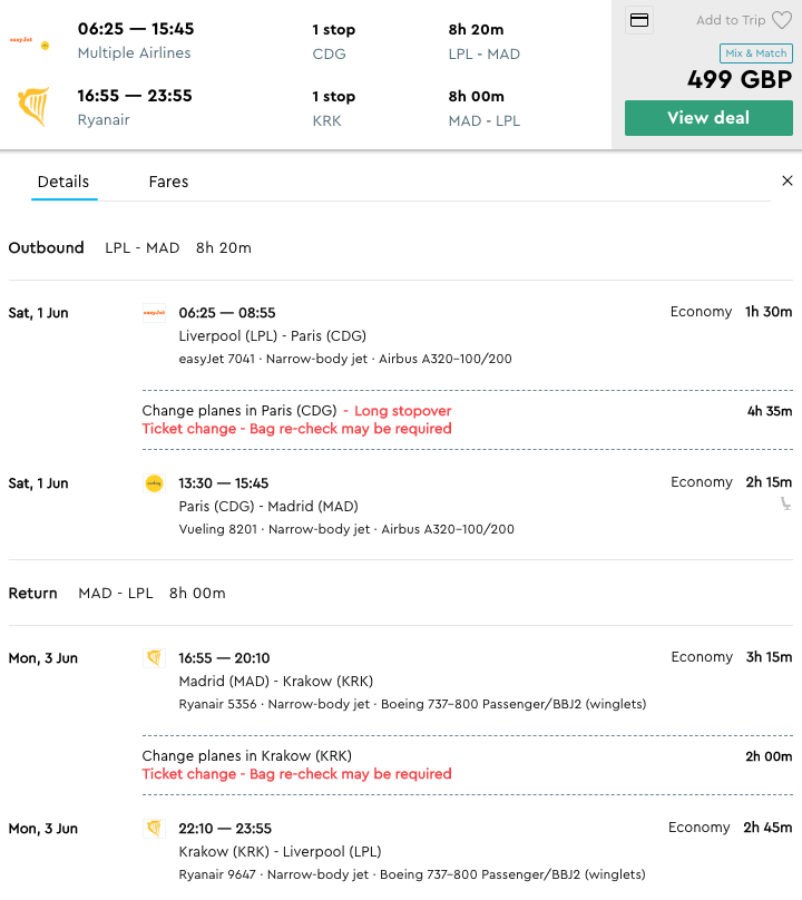 For Jade, I’m actually going to keep in a later departure so that it cuts down on annual leave needed getting to Krakow, however I am going to get rid of that 2050 flight option because I think that gets in just a tad too late.