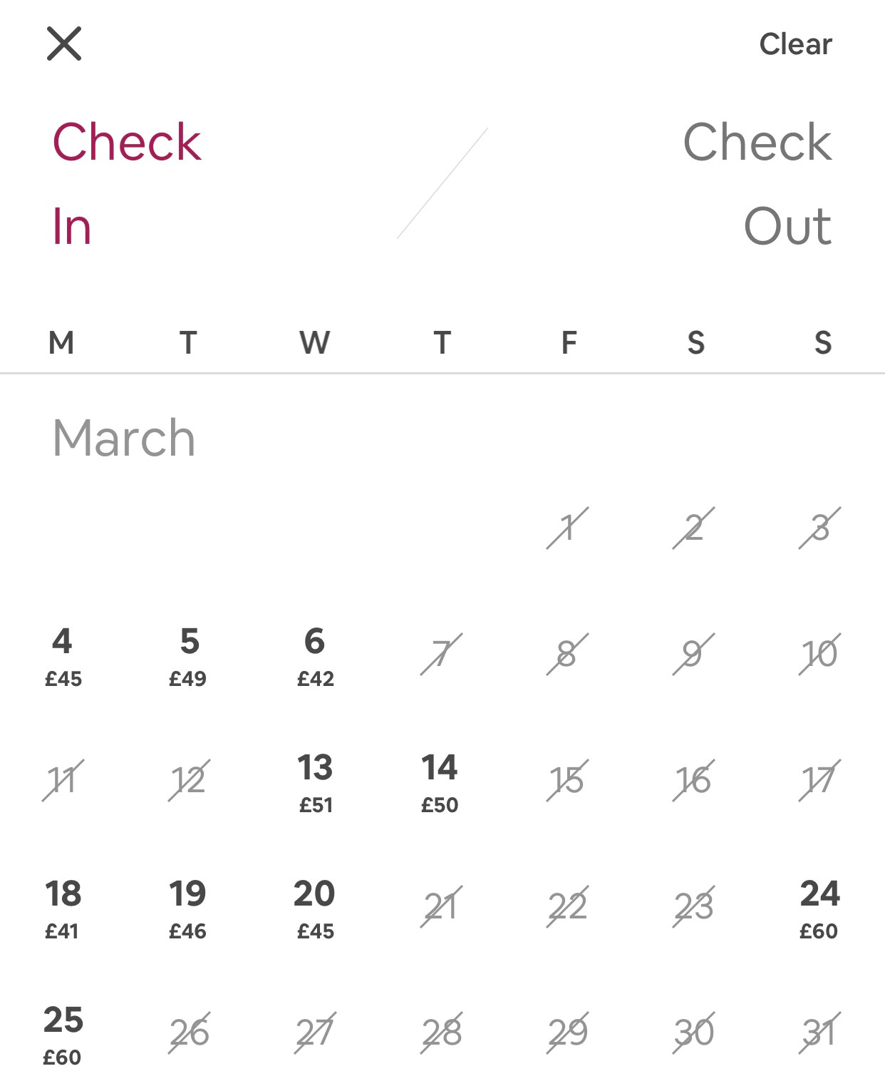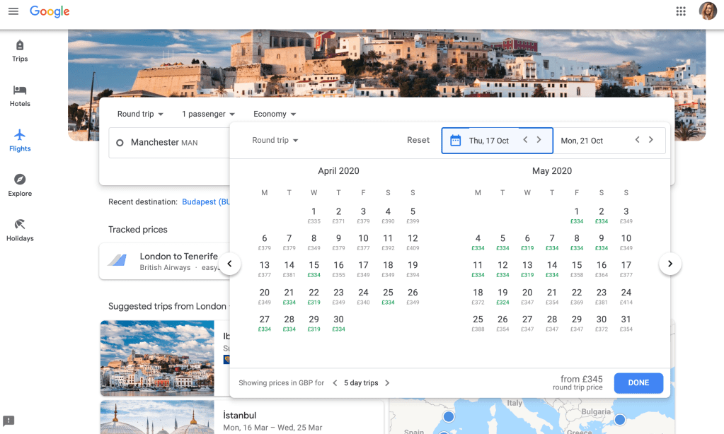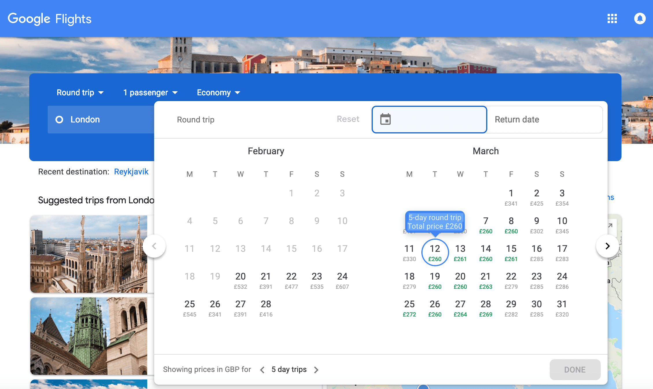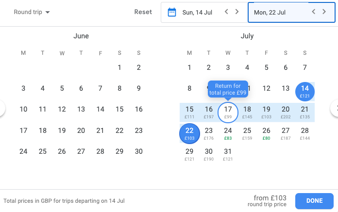 However, what Google Flights is amazing for is spotting the patterns. So, if the example dates are showing up as say, £400, you can then hit ‘reset’ on the dates, scroll through the calendar and look for other £400 dates