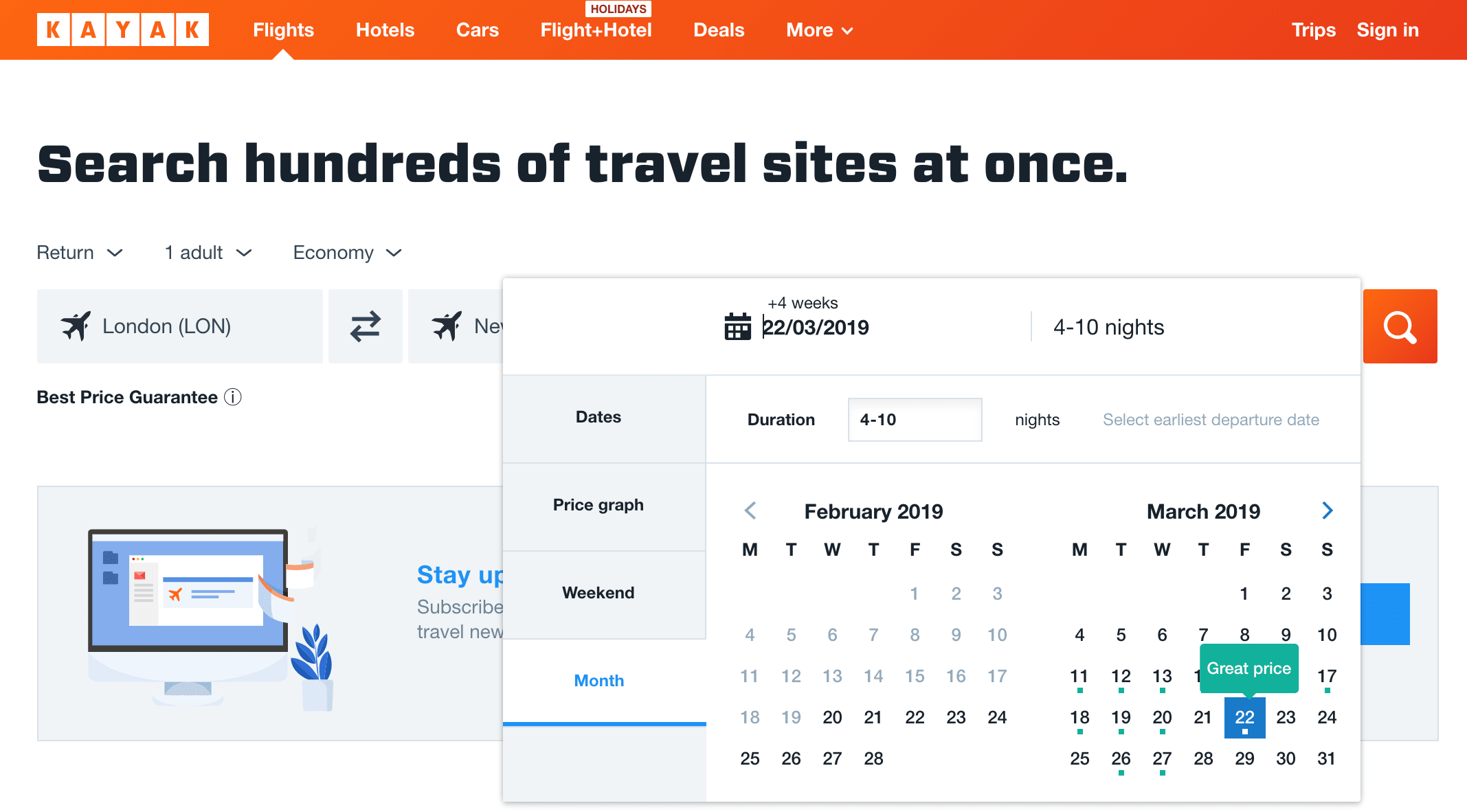 Once you’ve selected a destination, look to the right as this graph does allow you to toggle through the trip duration and you can spot where the cheaper prices will lie.