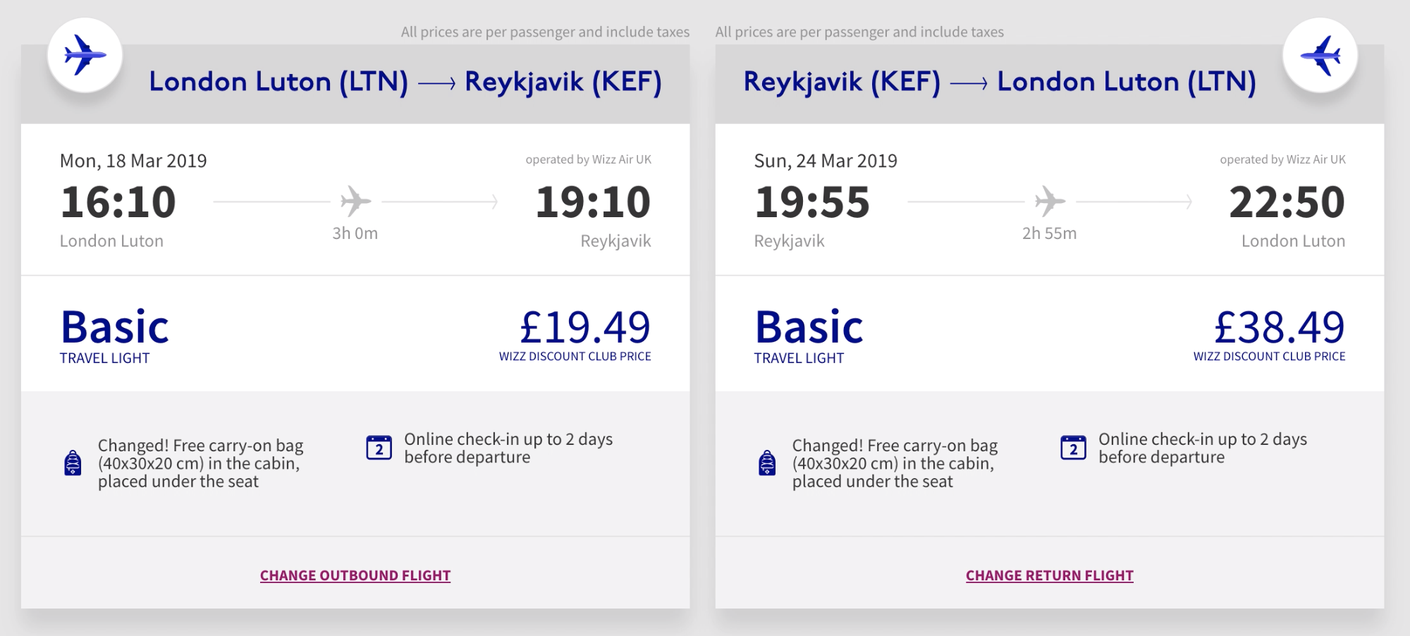 As we were travelling in the winter, we decided to add on one 20kg suitcase which cost £59 – ouch. However, as well as helping to keep us warm with the numerous jumpers packed inside, it also made financial sense as I was able to pack some food bits and towels that we’d later get charged to hire at the geothermal pools.